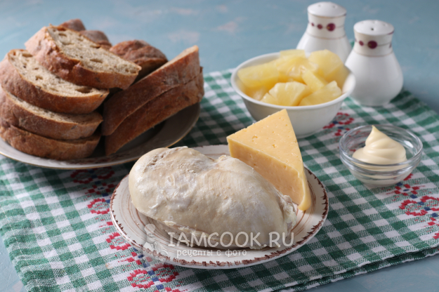 Для приготовления горячих бутербродов с курицей и ананасом подготовить из списка необходимые ингредиенты. Куриное филе можно предварительно сварить до мягкости в подсоленной воде. Также можно использовать грудку запечённой курицы.