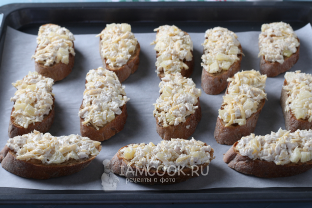 Разложить бутерброды на противень, застеленный пергаментом, и поставить в разогретую до 180 градусов духовку.