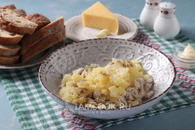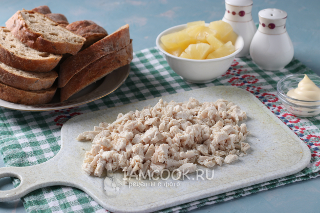 Измельчить ананасы, перед этим слив с них сироп. Соединить ананасы с курицей, посолить и поперчить.