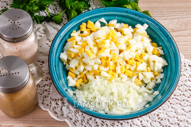Очистите отварные куриные яйца и промойте их в воде, нарежьте мелкими кубиками и добавьте в емкость с луком. Допустимо заменить куриные яйца перепелиными или утиными.