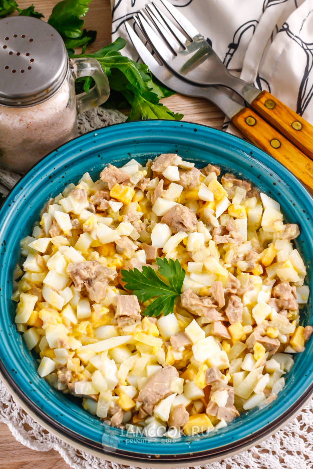 Украсьте салат из печени трески по-мурмански по своему вкусу и подайте к столу. Можно дополнить его несладкой выпечкой, сухариками, тостами и т.д.