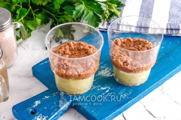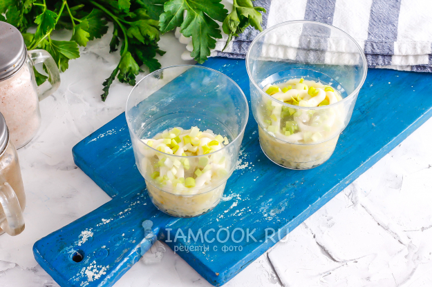В пиалу или креманку, в порционные стаканчики выложите слой отварного картофеля. Выложите по 1 ч.л. майонеза любой жирности. Промойте и измельчите репчатый лук, промойте его от горечи и добавьте на майонез. У меня было и немного зеленого лука.