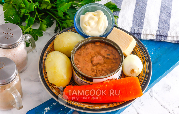 Подготовьте необходимые ингредиенты для салата «Мимоза» без яиц. Овощи отварите заранее в течение 25 минут и остудите 5 минут в ледяной воде, счистите кожуру и промойте.