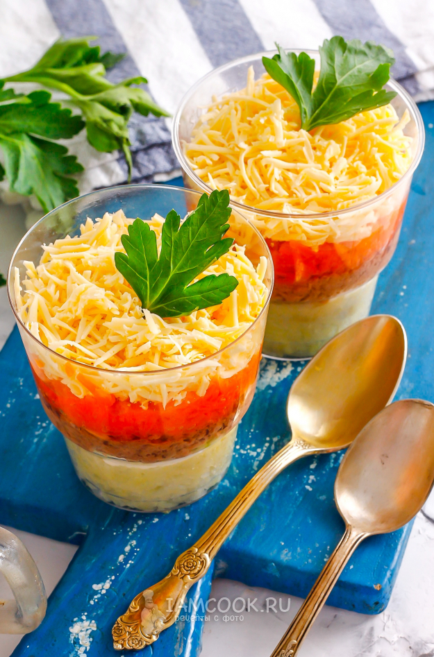 Выложите оставшийся майонез и аккуратно распределите его по поверхности морковного слоя. Натрите на терке с мелкими ячейками твердый сыр любого сорта и выложите последним слоем. Не приминайте - пусть верх салата будет воздушным. Поместите блюдо для пропитки в холодильник минимум на 20 минут.