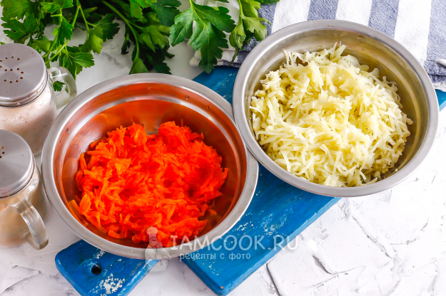 Натрите морковь и картофель в разные емкости на терке с мелкими ячейками.