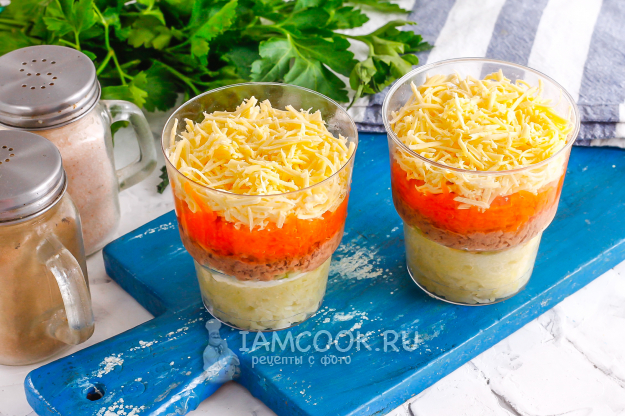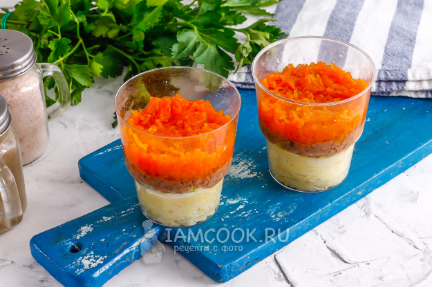 На слой тунца выложите натертую морковь. Обязательно посолите ее, так как морковь часто бывает сладковатой после отваривания.