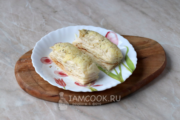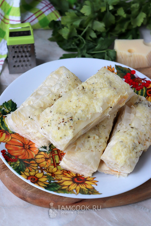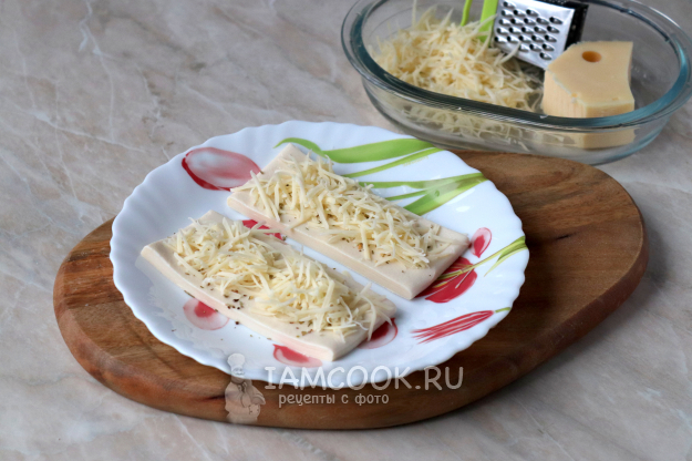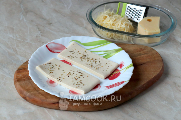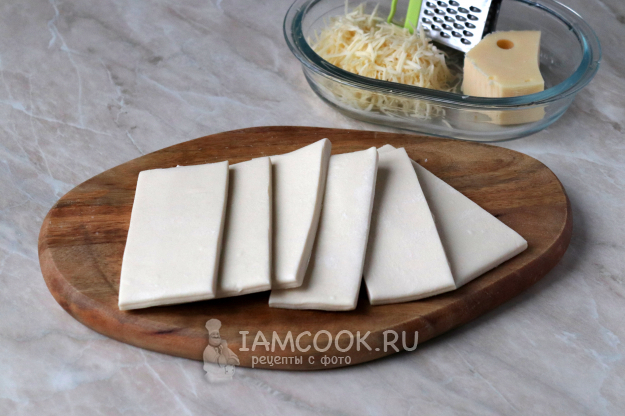 Тесто разморозьте при комнатной температуре и разрежьте на 6 примерно одинаковых полосок (как на фото). Твёрдый сыр натрите на тёрке со средними ячейками.