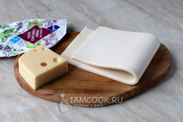 Возьмите необходимые ингредиенты для приготовления слоек из готового слоеного теста в микроволновке. Сыр можно использовать любых сортов главное, чтобы хорошо плавился.