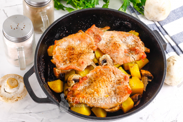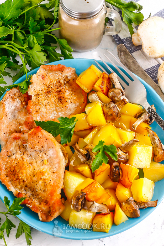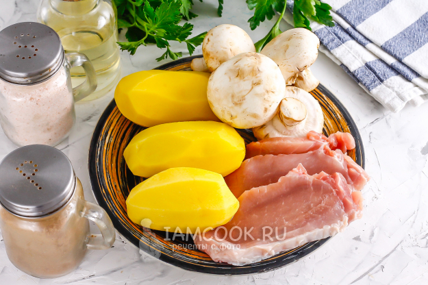 Возьмите необходимые ингредиенты для приготовления свиных отбивных с картошкой и грибами в духовке.