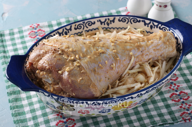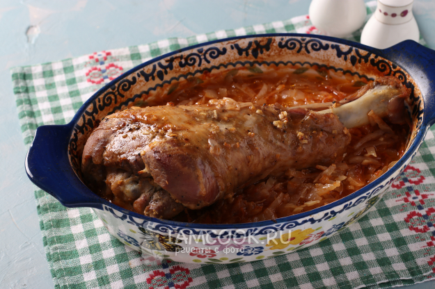 Форму немного смазать постным маслом, выложить всю капусту, а сверху - замаринованную голень.