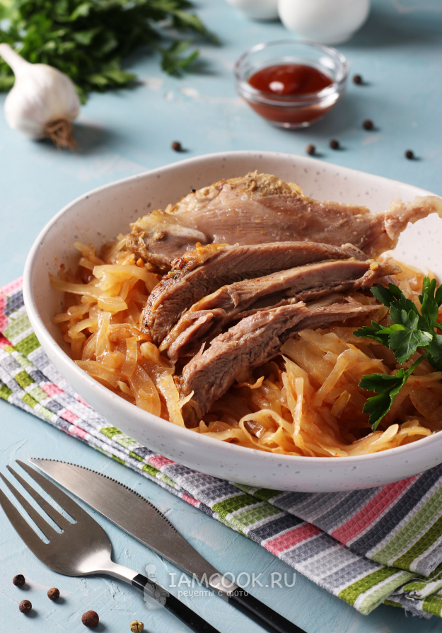 Готовое мясо срезать с кости и разделить на порции. Голенью такого объёма можно накормить 4 человека, но гарнира хватит только на двоих. Дополнительно можно сварить рис или картофель и смешать их с капустой.