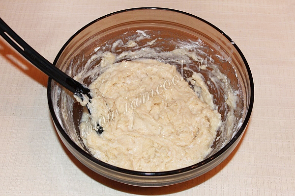 Теперь ВАЖНО - жидкую часть вливаем в сухую и перемешиваем ложкой движениями снизу вверх лишь до увлажнения муки (это около 15 движений ложкой).
