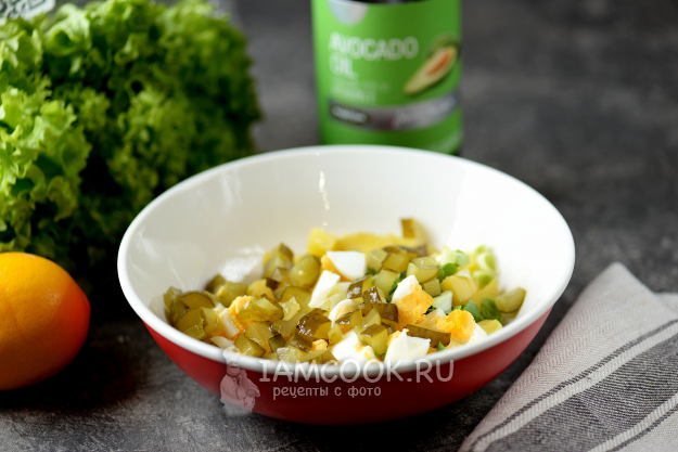Срежьте хвостики на маринованных огурцах, нарежьте огурцы чуть меньшим кубиком, нарубите зеленый лук, добавьте к картофелю.
