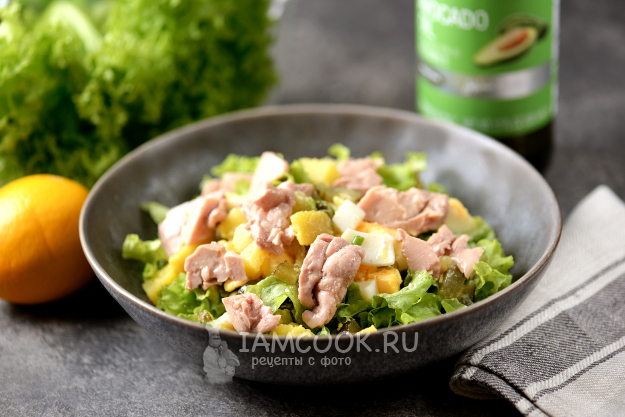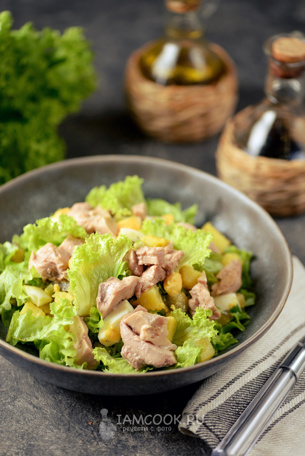 Выложите приготовленный салат на тарелку, в которой будете его подавать, сверху положите нарезанную кусочками печень трески и сразу же подавайте к столу.