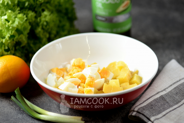 Картофель и яйца нарежьте крупным кубиком, переложите в глубокую миску.