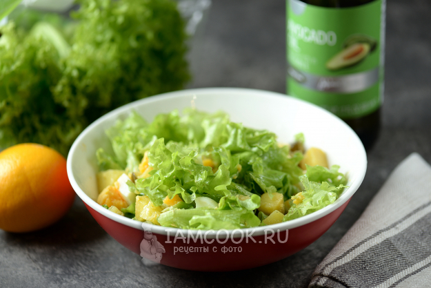 Порвите латук руками, также добавьте его к остальным ингредиентам, чуть посолите и поперчите, заправьте любимым растительным маслом, аккуратно перемешайте.