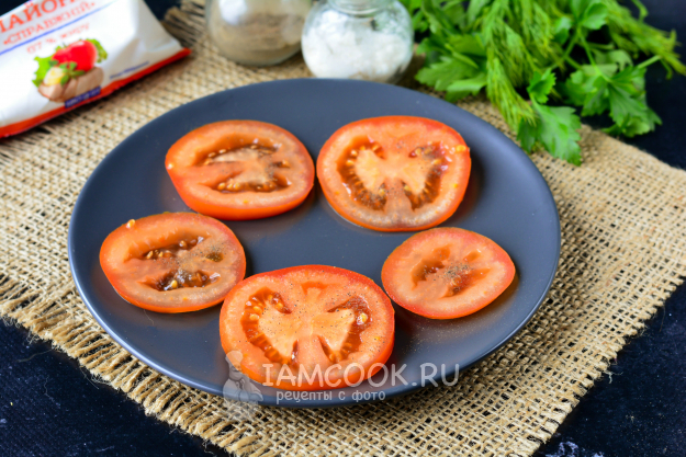 Нарежьте средними по толщине кружками помидоры, выложите на плоскую тарелку. Каждый кружок помидора слегка посолите и поперчите.