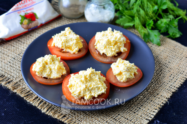 На каждый помидорчик выложите по 1-1,5 ч.л. сырно-яичной начинки - она будет кстати.
