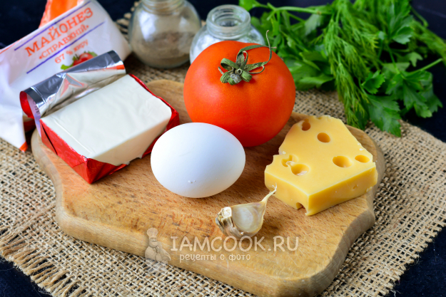 Для приготовления помидоров «под шубой» понадобятся следующие ингредиенты. Для начинки возьмите плавленый сыр, майонез и сваренные яйца. Для пикантности добавьте чеснок. Количество чеснока используйте по вкусу: чем больше его - тем острее закуска.
