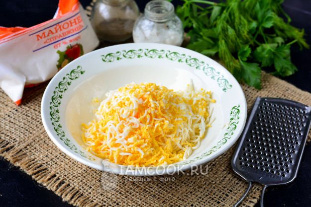 Сварите куриные яйца вкрутую, полностью их остудите, почистите и натрите на терке, всыпьте к плавленому сыру.