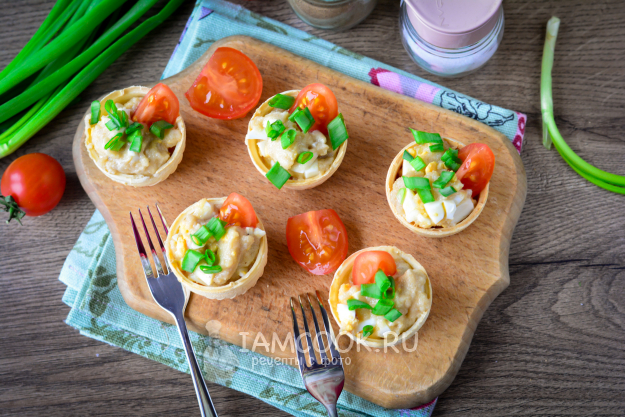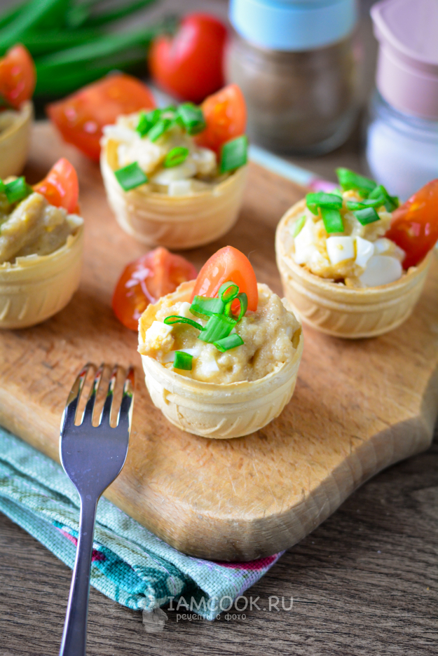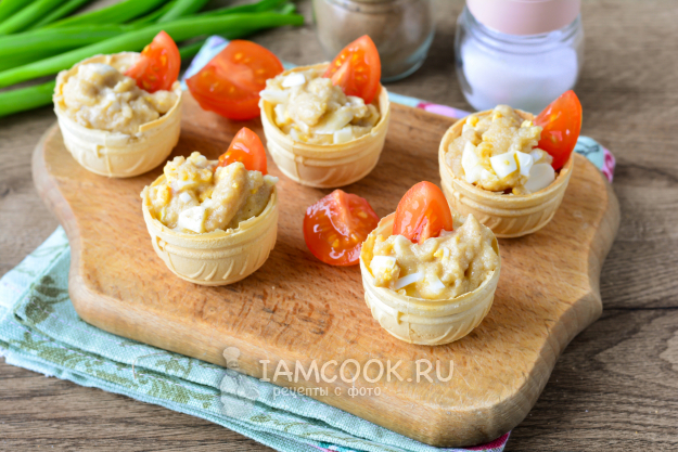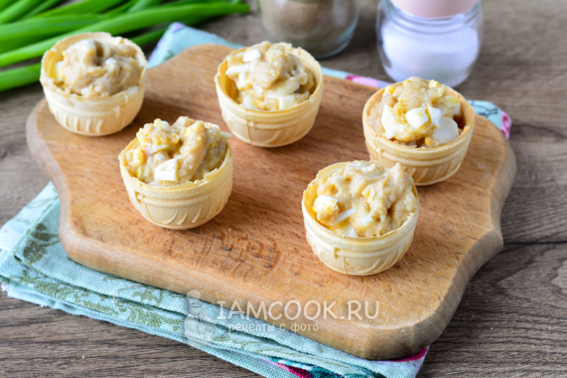 Наполните вафельные тарталетки рыбной начинкой.