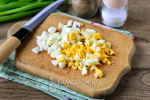 Сварите яйца вкрутую, затем остудите и очистите от скорлупы. Нарежьте яйца кубиками.