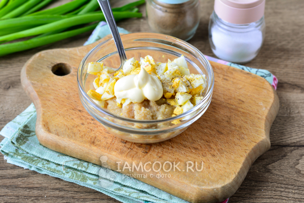 Добавьте в начинку немного майонеза - он придаст дополнительный вкус. Начинку хорошо перемешайте.