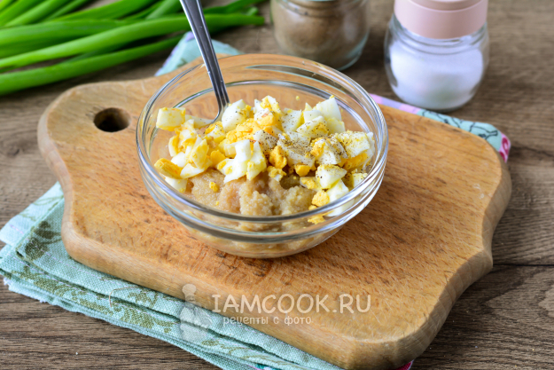 Выложите икру трески в небольшую емкость, всыпьте рубленые яйца, поперчите. Если икра не сильно соленая, можете посолить. Я не солила - у меня икра хорошо соленая.