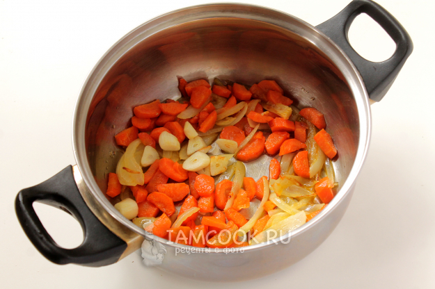 До золотистого оттенка обжарьте на постном масле крупно нашинкованные морковь, лук и чеснок.