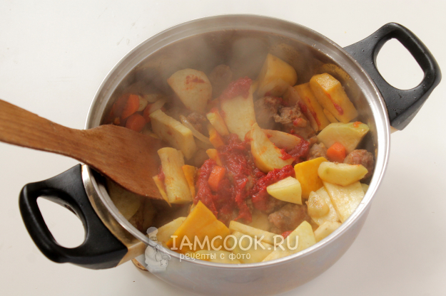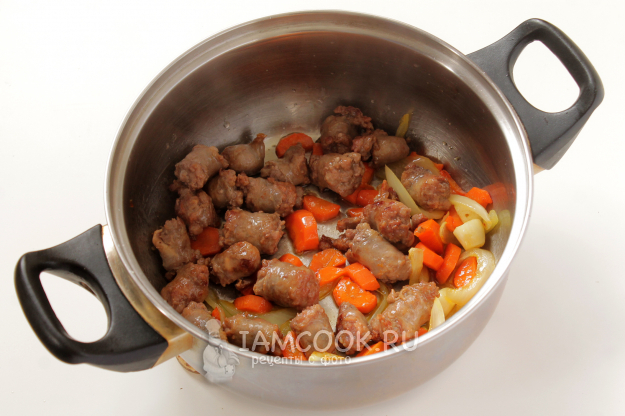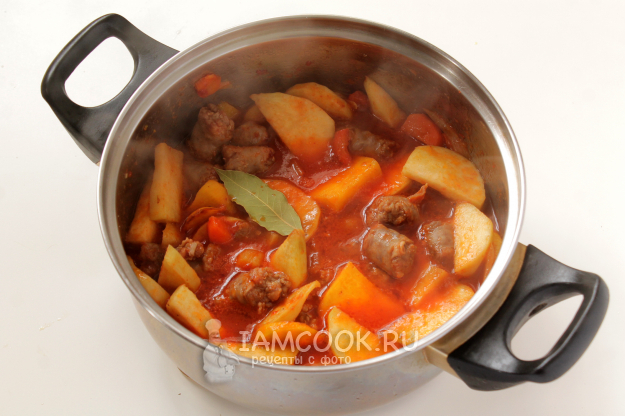 Влейте воду, бросьте лавровый лист — доведите до кипения, уменьшив нагрев, тушите под крышкой порядка 30 минут. Пробуйте. При необходимости дополнительно посолите-поперчите.
