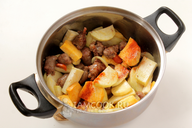 Приправьте солью, перцем, паприкой или другими специями. Перемешайте и пропитайте репу мясным соком, маслом порядка 2-3 минут.