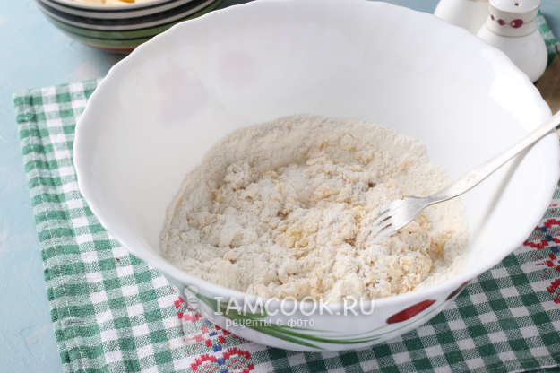 Далее приготовить чесночные галушки. В миску разбить яйцо, взболтать его с солью, добавить постное масло и муку. Перемешать сразу вилкой, затем продолжить замес руками.