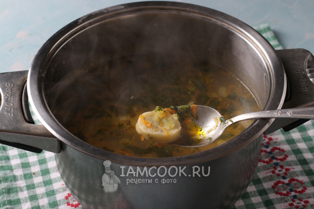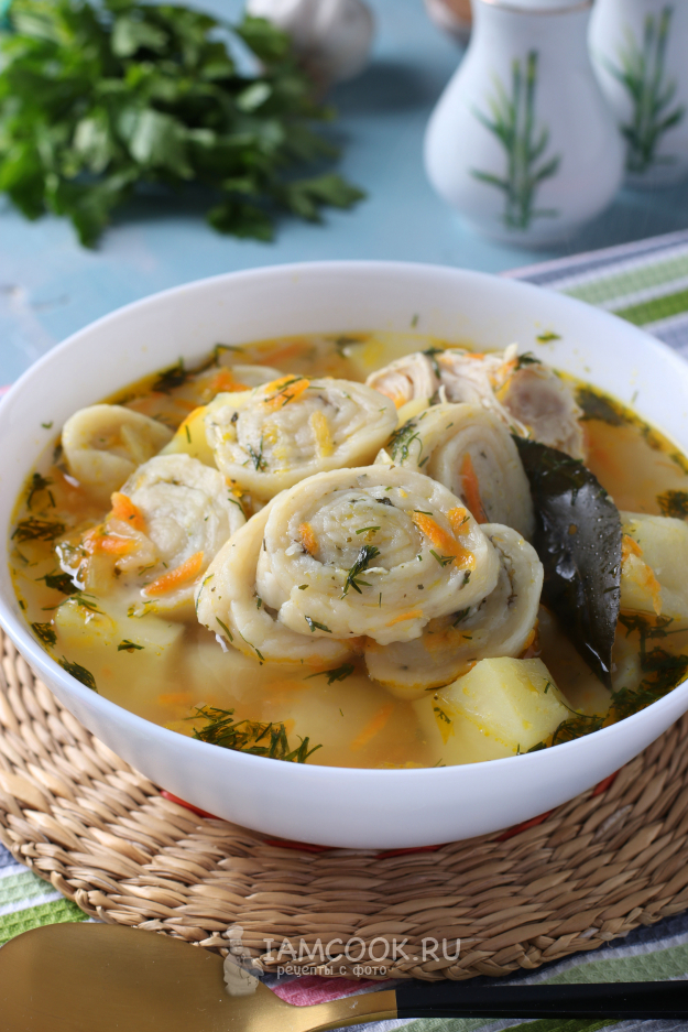 Опустить галушки в суп, добавить перец и лавровый лист, перемешать и варить 15 минут. В самом конце добавить в суп измельчённый укроп или петрушку.