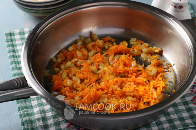 Разогреть в сковороде постное масло и обжарить в нём лук с морковью до мягкости.