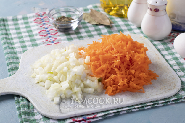 Пока варится бульон, выполнить все остальные процессы. Почистить лук с морковью, морковь натереть на тёрке, лук нарезать кубиком.