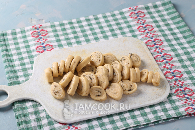 Нарезать рулет шайбочками 5 мм.