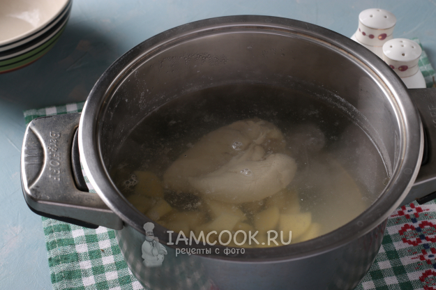 Когда курица будет готова, опустить в бульон картофель и варить 10 минут.