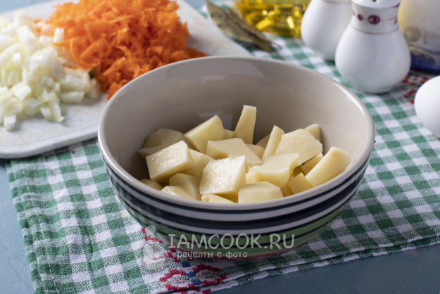 Также почистить картофель и также нарезать его кубиком.