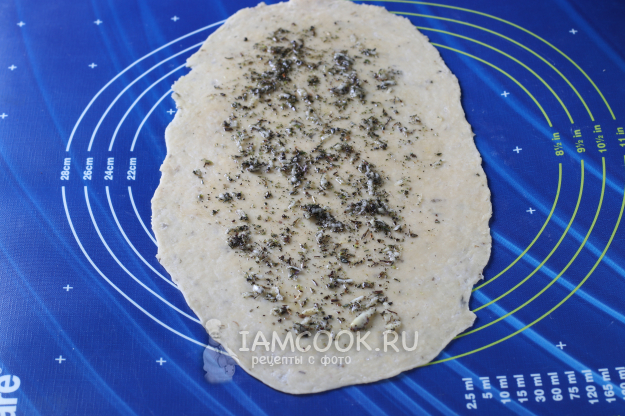 Тесто тонко раскатать на коврике, если необходимо - припылить слегка мукой. Поверхность теста смазать чесночной массой, не доходя до края 1.5 см, иначе тесто потом не склеится и будет разворачиваться.