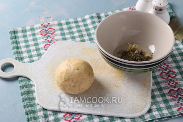 Вымесить мягкое тесто, не липнущее к рукам. В пиале смешать постное масло, измельчённый чеснок и итальянские травы.