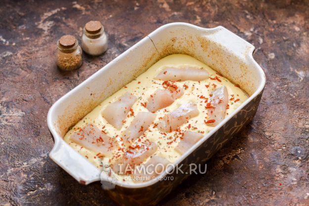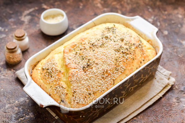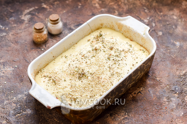 Поверх рыбы влить вторую половину теста. Посыпать заготовку специями и кунжутом.