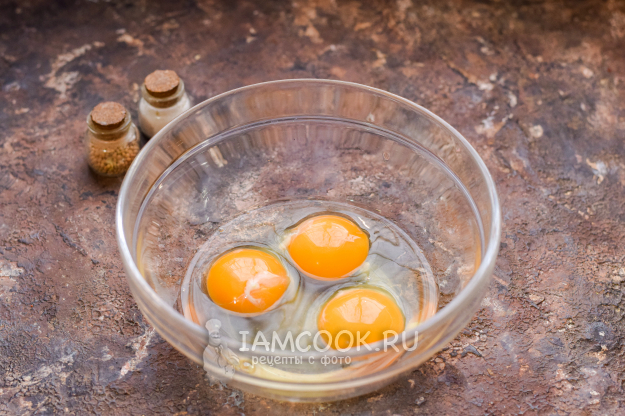 Взять глубокую миску для приготовления теста - вбить в миску три крупных куриных яйца.