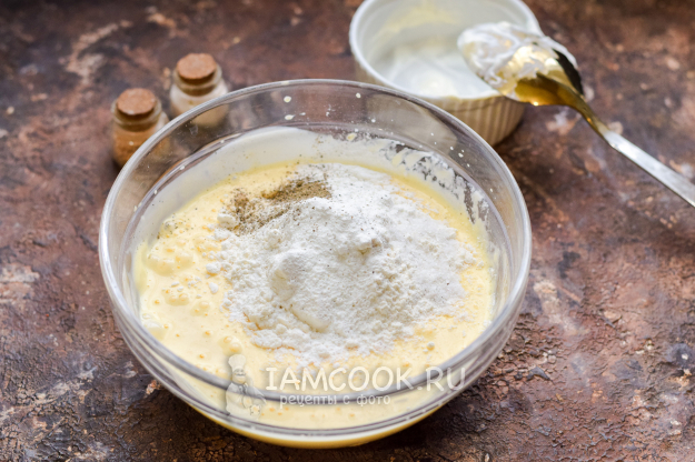 Добавить пшеничную муку, соль, перец и разрыхлитель теста. Перемешать снова тесто.