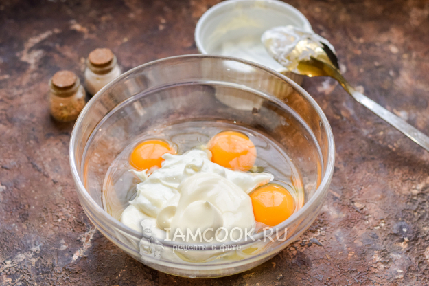 Добавить к яйцам сметану и майонез. Процент жирности особого значения не имеет, у меня сметана - 20%, майонез - 67%. Перемешать все ингредиенты при помощи миксера.