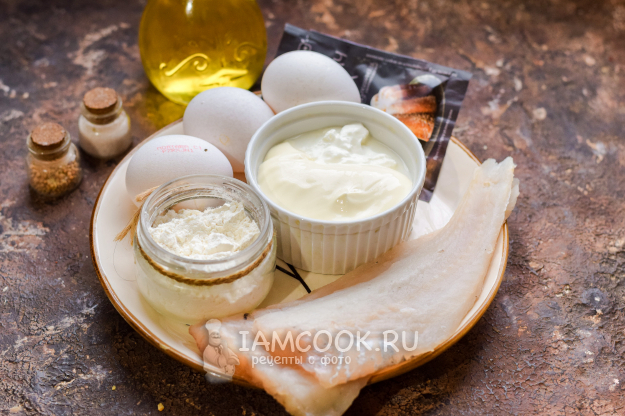 Подготовить все продукты для заливного пирога с минтаем. Филе минтая заранее достать из морозильной камеры, разморозить, хорошо промокнуть кухонными бумажными салфетками, чтобы убрать всю лишнюю жидкость из рыбы. Духовку прогреть до 180 градусов.