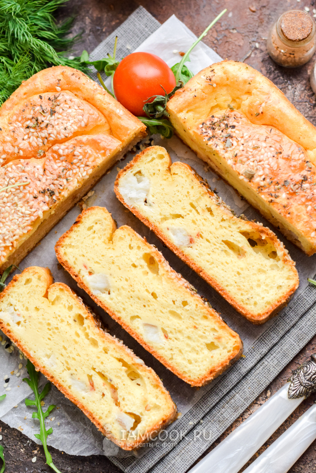 Выпекать заливной пирог с минтаем 40-45 минут. Проверить готовность шпажкой. Готовый пирог подавать к столу.