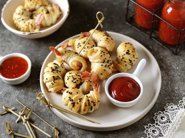Готовые канапе с креветками и ананасом на шпажках сразу можно подавать к столу.