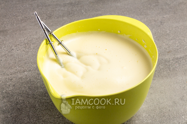 Далее займемся тестом. Взбейте яйца со щепоткой соли и сахаром в пышную массу в течение 5-10 минут с помощью миксера.