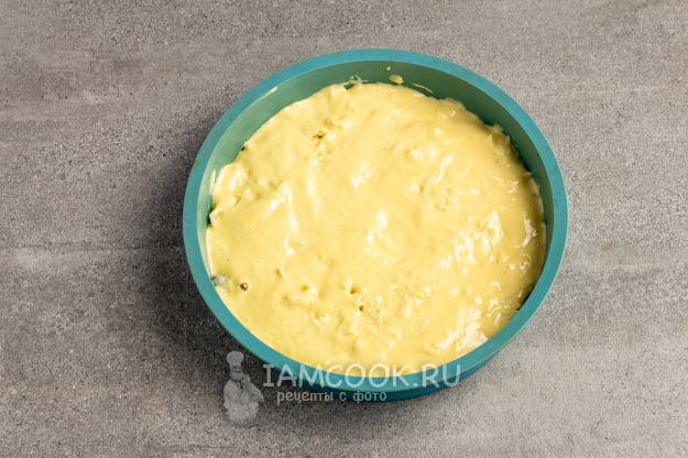 В форму для выпечки выложите половину теста. Далее положите всю капусту равномерно. А затем распределите вторую часть теста. Форма у меня силиконовая и в смазывании маслом не нуждается. Если у вас какая-то другая форма, то, возможно, вам понадобится её смазать маслом.