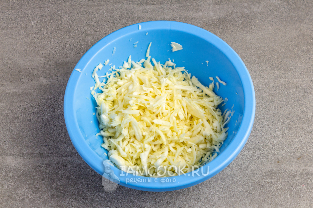 Первым делом подготовим начинку. Для этого нашинкуйте капусту ножом или натрите на специальной тёрке. Посолите по вкусу и хорошенько пожмякайте рукой, чтобы она стала мягче.